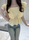 ポコポコとしたふくれ生地で愛嬌たっぷりに仕上げたブラウス。たっぷり肩からウエストにかけて施したフリルで、顔回りが華やぐ。