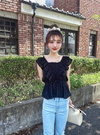 クシュっとした表面感のある生地に細かなドットを施し、レトロガーリーに仕上げたブラウス。たっぷり肩からウエストにかけて施したフリルで、顔回りが華やぐ。