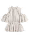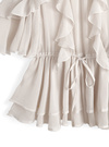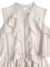 胸元から裾にかけて流れるように重ねたフリルが、華やかさをアップグレード。
