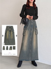 ヴィンテージ感溢れるルックスに仕上げた、デニム素材のロングスカート。両サイドにあしらった大きめのカーゴポケットがアクセントに。