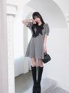 ふんわりとしたパフスリーブやフレアシルエットがさらにフェミニンムードを高める。
