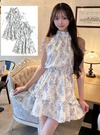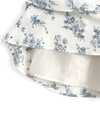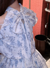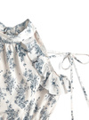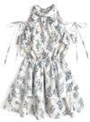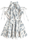 繊細なタッチのフラワー柄プリントをあしらったフェミニンなミニワンピース。バックネックや肩にあしらったリボンディテールが甘さを添えるポイント。