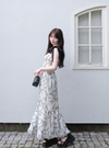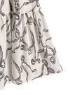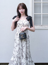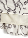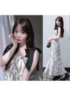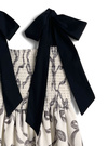 リボン柄のジョーゼット生地で仕立てた、上品でフェミニンな雰囲気のワンピース。ショルダー部分をリボンデザインにすることで、顔まわりを華やかに演出。