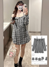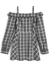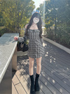 シックなチェック柄生地で仕立てたオフショルデザインのミニワンピース。大胆に開いたデコルテラインが女性らしさを引き立てるポイント。