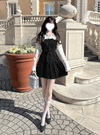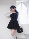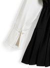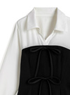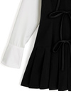 きちんと感のあるシャツドッキングを施した清楚な雰囲気のミニワンピース。異素材切り替えのコントラストがこなれた印象を与えつつ、フロントにリボンを3つ並べてガーリーさをオン。