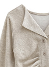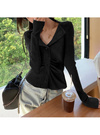 シャープな印象を与える襟付きのデザインがきちんと感をもたらすトップス。フロントはギャザーデザインとリブ編地になっており、立体感と表情を生み出す。