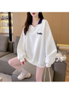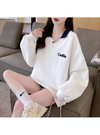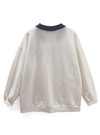 ゆったりとしたサイジングがリラックス感をもたらすスウェットトップス。配色カラーで仕立てたVネックが顔まわりをすっきり見せ、抜け感をプラス。