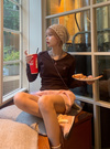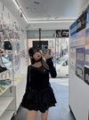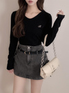 シャープなVネックラインが女性らしい抜け感を演出し、すっきりとした印象に。