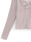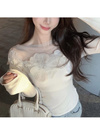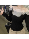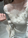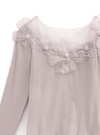 デコルテを華やかに彩るフラワーモチーフとパールが視線を引くトップス。リブカットソーの柔らかなフィット感とシアー素材の透け感が絶妙なバランス。