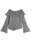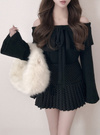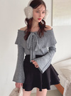 滑らかな肌触りでミックス感のある編地が印象的なニットトップス。ビッグカラーのオフショルダーや胸元のリボンディテールでフェミニンな雰囲気を演出。