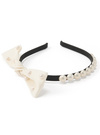 ツヤッとした光沢感のあるリボンモチーフのキュートなカチューシャ。パールをあしらうことで、さらに華やかな雰囲気に仕上げた。