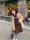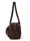 しっとりとした風合いのスエード調素材を使ったボストンバッグ。立体的なベルト付きポケットはアクセントになりつつ、小物を入れるのにも便利。