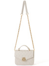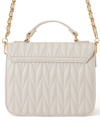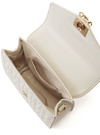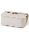 立体的なキルティングデザインが上品な印象を与えるバッグ。フラップ部分にゴールドのロゴプレートをあしらい、さらに華やかさをプラス。