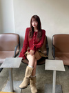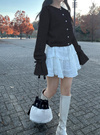 フロントにはパールボタンを並べ、フェミニンな印象を引き立てる。