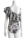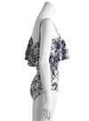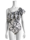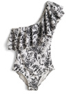 トワルドジュイ風の手書き風プリントで大人な表情を見せるワンピース水着。たっぷりとしたラッフルをショルダーからネックにかけてあしらい、華やかな印象に。