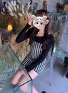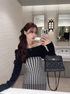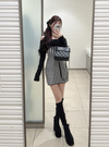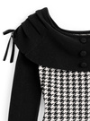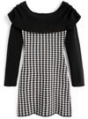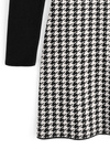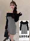 千鳥格子と無地ニットでコントラストを効かせたオフショルワンピース。肩のギャザーやリボン、くるみボタンがフェミニンな印象をプラスする。