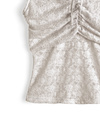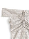 フラワー柄レースが広がる、フェミニンなムード漂うオフショルトップス。胸元のリボンディテールが視線を引き寄せ、華やぎのあるスタイリングに。