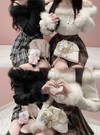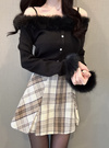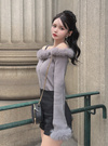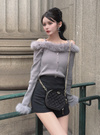 毛足の長いエコファーをふんだんに使って季節感たっぷりに仕上げたオフショルトップス。ふわふわのファーが顔まわりや手元を華やかに印象付ける。