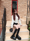 異素材をドッキングした、ガーリーな印象のレイヤード風のトップス。胸元のフリルやリボンデザインが甘さを添えるアクセント。