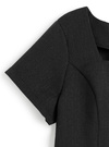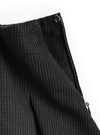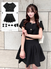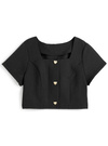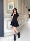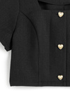 スクエアネックがデコルテをきれいに見せ、洗練されたバランスに。トップスのハートボタンがポイントになり、甘さをひとさじ加える。