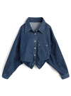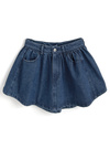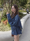 ハリのあるデニム生地を使用したシャツとスカートのセットアップアイテム。シャツはルーズ感のあるドロップショルダーに、ブラウジングっぽいフォルムが特徴的。