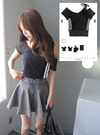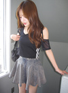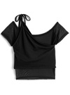 異素材を組み合わせたアシメデザインの個性派トップス。シアー生地にワンショルキャミのレイヤードスタイルが魅力的。