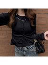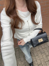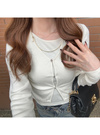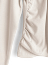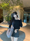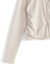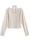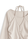 ノーマルなリブトップスにホルターネックのキャミソールを重ね着したようなアイテム。両サイドにギャザーをたっぷりと寄せ、立体感のあるフォルムをメイク。