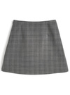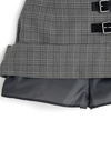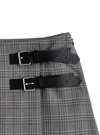 クラシカルなグレンチェック柄生地で仕立てたミニスカート。ラップ風デザインにフェイクレザーのベルトモチーフがアクセント。