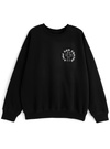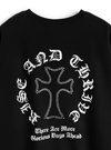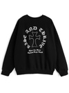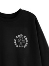 胸元やバックスタイルに施されたサークルロゴがポイントになったスウェットトップス。ゴシック調フォントのかすれロゴや、ラインストーンのクロスモチーフがクールな印象をプラス。