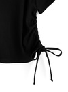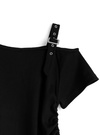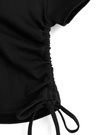 ベルトモチーフのショルダーデザインでエッジを効かせたワンショルトップス。両サイドにはドロストリボンをあしらい、くしゅっとした立体シルエットをメイク。