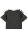 配色のサイドラインやロゴ刺繍をあしらったスポーティーな雰囲気のTシャツ。コンパクトなショート丈にすることで、女性らしく着こなせるのがポイント。