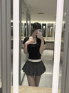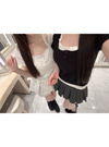 キャミソールにヘンリーネックトップスを重ねたようなレイヤード風デザイン。胸元からチラッと覗くレースやミニリボンがガーリーライクなアクセント。