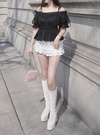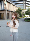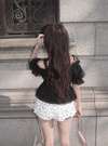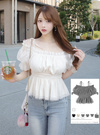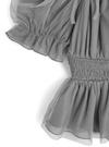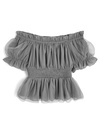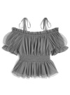 ラメシアーにチュール生地を重ねた上品で華やかな印象のトップス。肩まわりをすっきり見せるオフショルダーにリボンのストラップがポイント。
