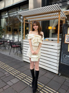 肩まわりをすっきり見せるオフショルダーで、女性らしい肌見せを叶える。