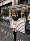 コンパクトなショート丈はウエスト位置を高く見せ、スタイルアップ効果も◎。