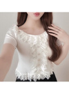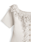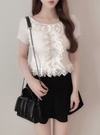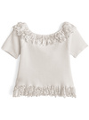 リブニットに繊細なレースを重ねて、エレガントな表情を生むトップス。襟元から裾まで波打つフリルを配し、女性らしさを引き寄せる。