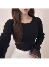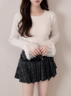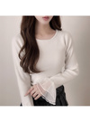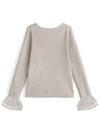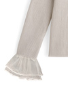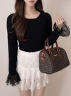 ベーシックなクルーネックニットに異素材フリルがフェミニンな雰囲気のトップス。袖口には2種類のチュールを重ね、ボリュームのある華やかな手元を演出。