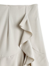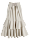 アシンメトリーなティアードデザインが優雅で上品な印象を与えるスカート。動くたびに揺れるラッフルフリルは、女性らしさを最大限引き立ててくれる。