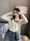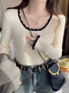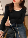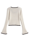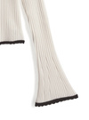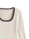 立体感のあるリブ編みがスタイルをすっきり見せてくれるトップス。ネックや袖口などに配色スカラップをあしらうことでメリハリのあるルックスに。