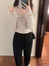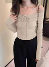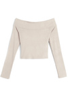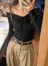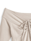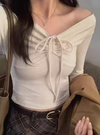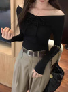 フロントのドロストリボンがアクセントになったオフショルトップス。立体的に仕上げた胸元が美しいバストラインをメイク。