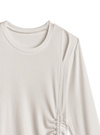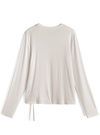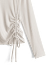 ドロストリボンをキュッと絞れば、アシンメトリーなフォルムにアレンジも可能。