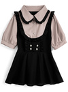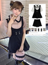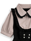 キュートなフリル使いが乙女心くすぐるセットアップアイテム。ブラウス部分のフリフリ襟やパフスリーブ、フロントのパールボタンが甘さを際立たせるポイントに。