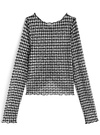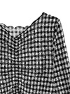 透け感のあるシアー素材にギンガムチェック柄を重ねたトップス。中央にシャーリングを寄せた立体的なディテールが、フェミニンさを添える。