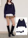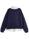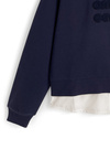 シャツにスウェットを重ね着したようなドッキングデザインのトップス。フロントにあしらった同色のフェルトロゴがアクセント。