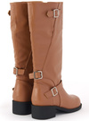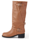 柔らかいフェイクレザー素材を使用したロングブーツの登場。所々にベルトモチーフをあしらい、アクセントを加えたデザイン。