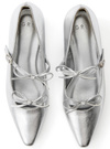華奢なダブルリボンがアクセントになった、ガーリーな雰囲気のパンプス。つま先はシャープなポインテッドトゥで、すっきりとした印象で美脚効果も叶う。