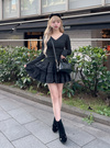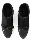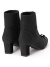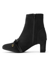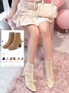 スエード調の生地を使用し、上品な雰囲気に仕上げたショートブーツ。つま先やヒール部分に艶感のあるベロア素材を使用し、リボンデザインを加えることでフェミニンな印象をプラス。