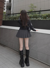 レッグカバーをかぶせたようなワイドシルエットのロングブーツ。サイドのジップやベルトモチーフが、モードでエッジの効いたアクセントに。