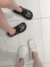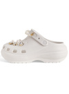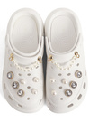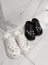 キラキラのチャームを贅沢にあしらい華やかに仕上げたクロッグサンダル。パールストラップやホールにあしらったストーン&パールは取り外し可能なので、自分好みにカスタマイズできる。